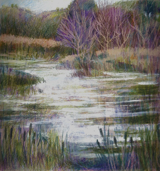 I used a mix of Jakar and Derwent electric erasers to 'draw' back into it, creating those paler trees, against a dark background, darkening the background further and simplifying, taking out the distant dry reeds/hay, which is the colour of the paper; creating a swathe of water by using white gouache and darkening sections, leaving other sections with traces of previous marks left as reflections and finally adding the foreground reeds.